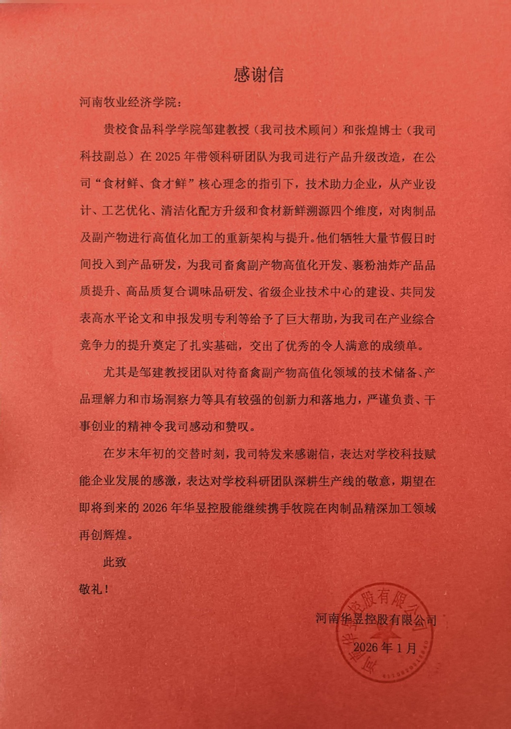近日,河南华昱控股有限公司(原河南众品食业股份有限公司)专程向我院食品科学学院院长邹建教授团队发来感谢信,对其团队在公司技术革新与产业升级进程中提供的鼎力支持与卓越贡献表示衷心感谢。这封情真意切的感谢信,不仅是对食品科学学院科研团队学术造诣与奉献精神的高度认可,更是我院坚持产学研协同创新、服务社会经济发展的生动写照。